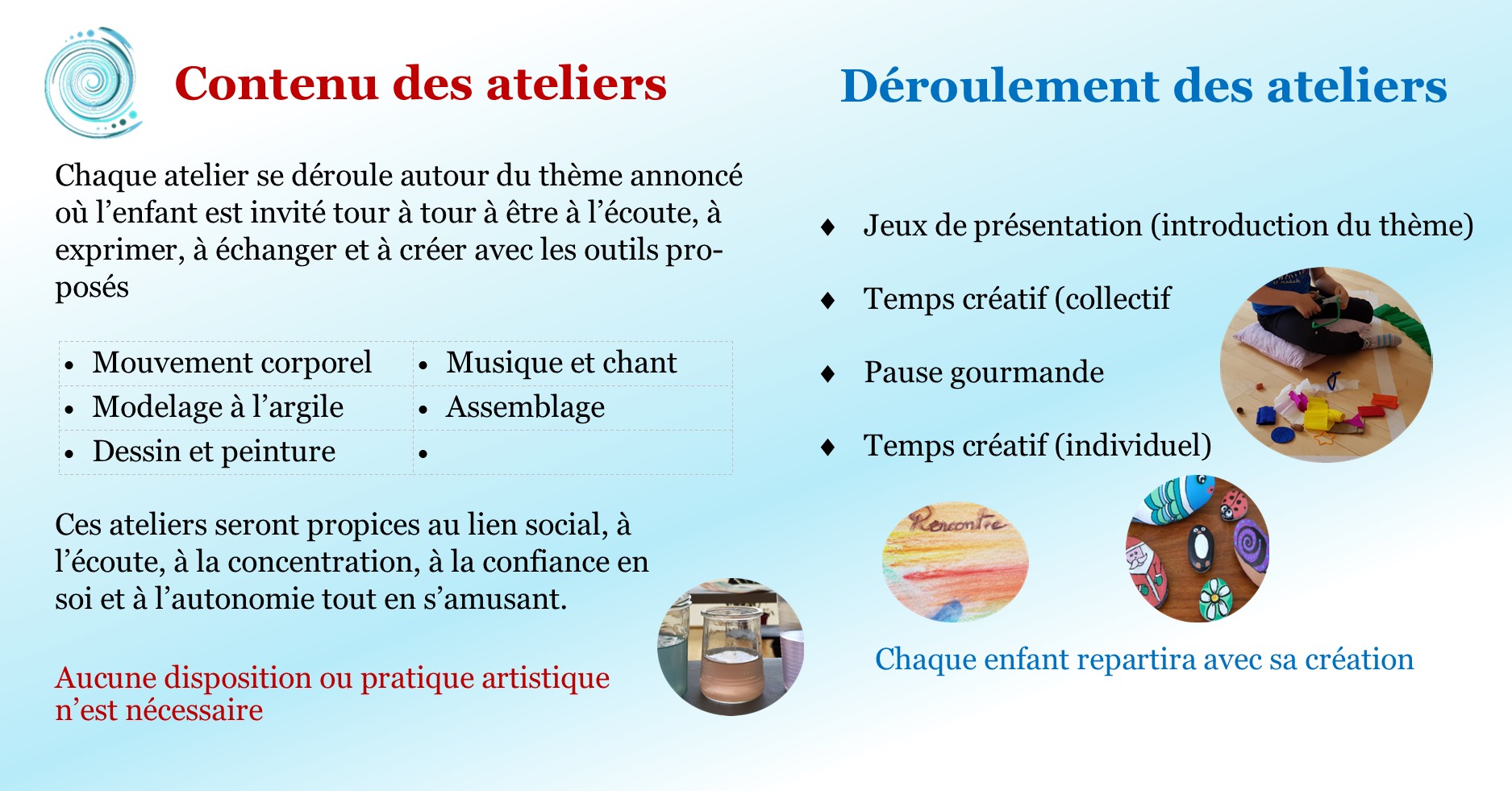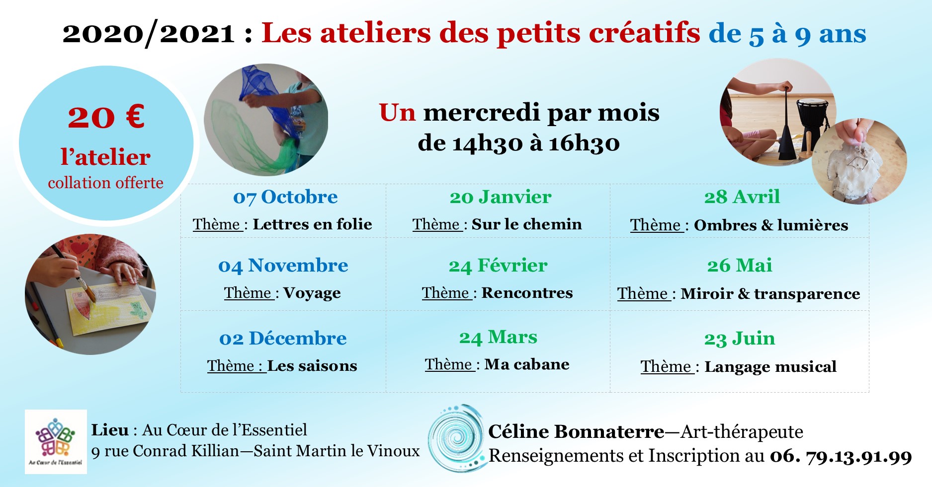 Afin que le petit créatif ou la petite créative soit le plus spontané(e) possible et se laisse porter par la découverte ; le détail des outils utilisés dans chaque thème n’est pas dévoilé dans le programme. Pour toutes informations et inscriptions, contactez-moi au 06.79.13.91.99